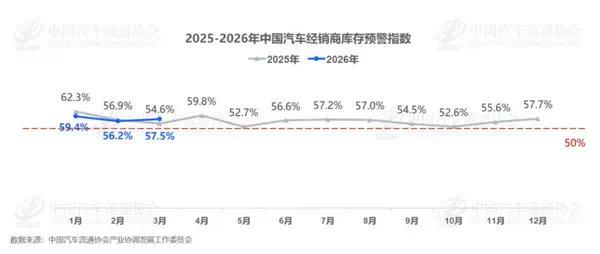 数据显示,2026年3月中国汽车经销商库存预警指数为57.5%,与去年同期相比上升了2.9个百分点,环比上升1.3个百分点,且该指数位于荣枯线之上,反映出当前汽车经销商库存压力有所增大。